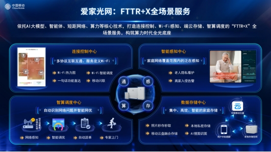 作为家庭的全光底座,FTTR产品带给用户的不仅仅是网络连接的能力,还包括Wi-Fi感知、端云存储、智算调度等“FTTR+X”全场景服务。在连接控制方面,除了对Wi-Fi网络的智能管理和调度,还通过蓝牙、星闪、移动闪联等技术实现了家庭设备的多协议互通互联。搭载Wi-Fi人体感知技术,实现家庭范围内的通感一体化,不侵犯用户隐私的同时,还能全天候守护家人安全,可广泛应用于老人看护、离家入侵告警等场景。作为智算调度中心,通感存算一体FTTR不仅可以利用算力实现网络问题的自发现、自优化,还可与家中的其他设备进行算力共享,实现云电脑存储空间扩容,及普通摄像头的AI化安防应用。作为家庭的数据存储中心,用户可以在“手机—FTTR本地存储—移动云盘”三者间实现文件的秒存秒取,同时依托AI智能引擎,可实现照片、视频等内容的智能分析及聚类呈现,由此打造集中、高效、智能的家庭存储。